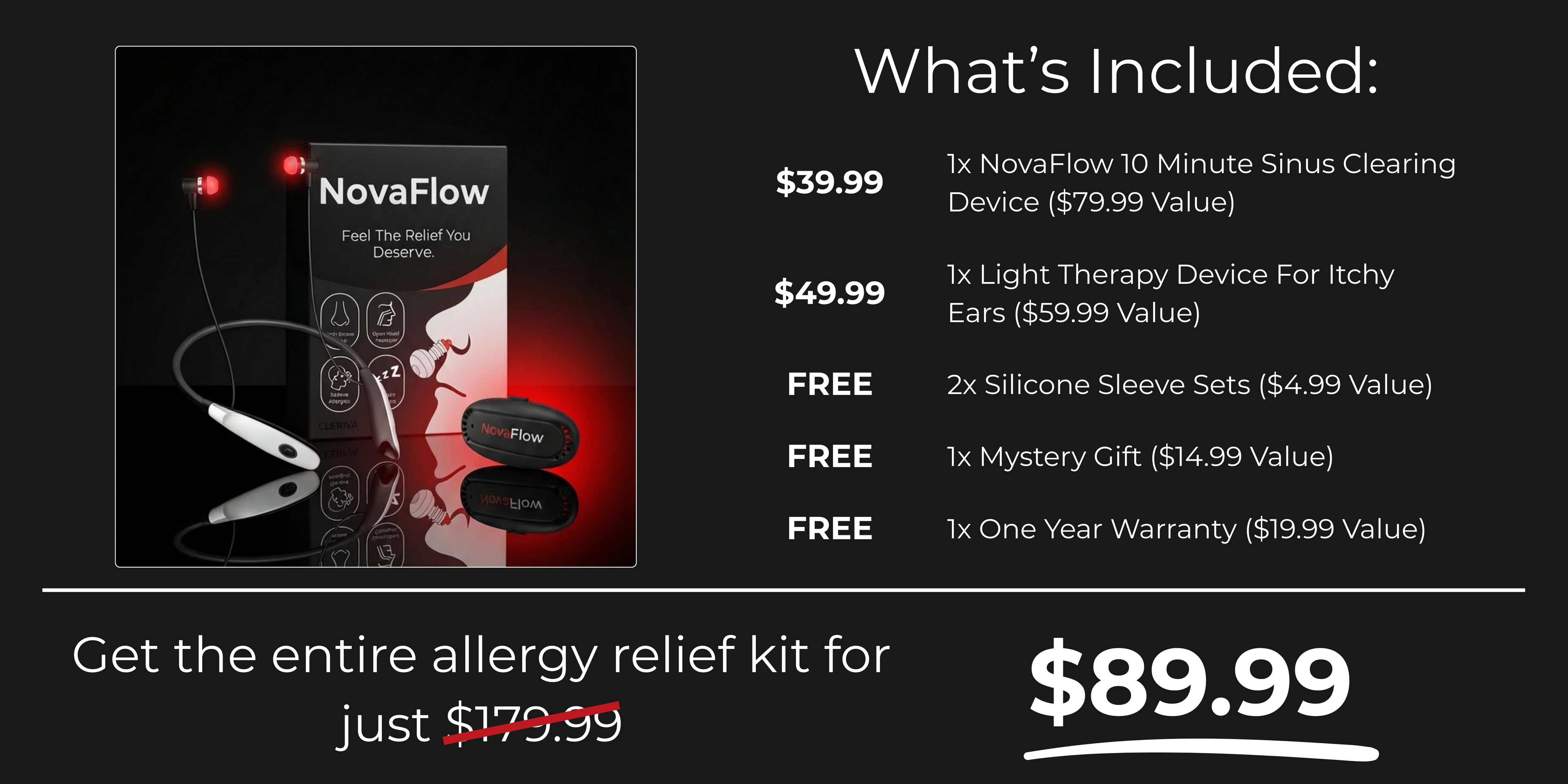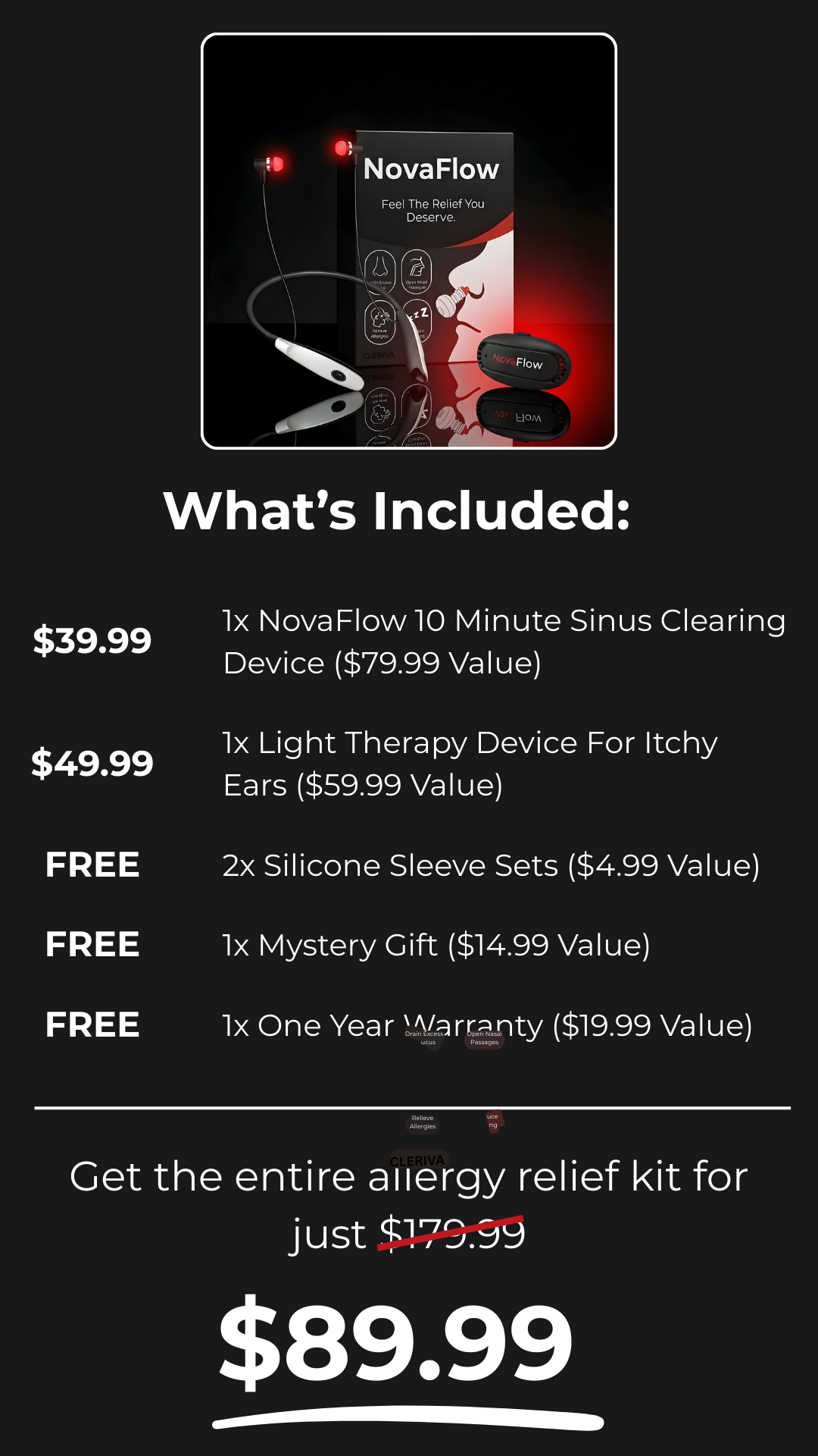 This kit includes our two flagship products: NovaFlow for targeted sinus relief and NovaBuds for inner ear relief. Together, they deliver a comprehensive, all-in-one solution for allergy and sinus comfort.