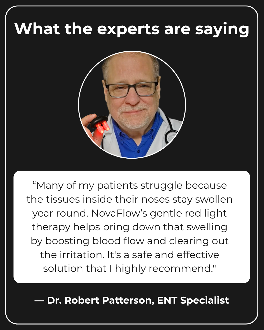 “Many of my allergy patients struggle because the tissues inside their noses stay swollen all year. NovaFlow’s gentle red‑light therapy helps bring down that swelling by boosting blood flow and clearing out the irritation. I now recommend NovaFlow to my patients before we even discuss surgical options.”