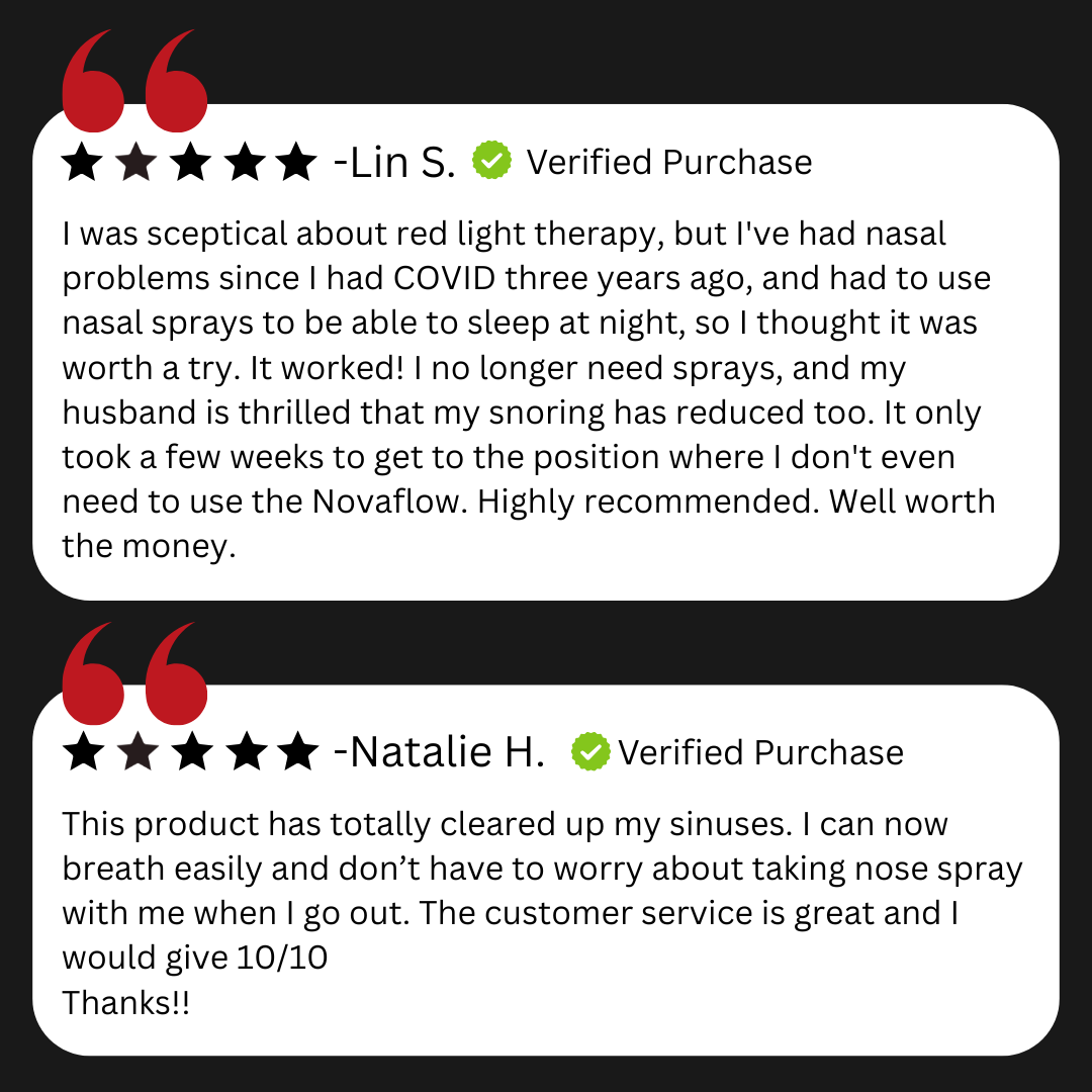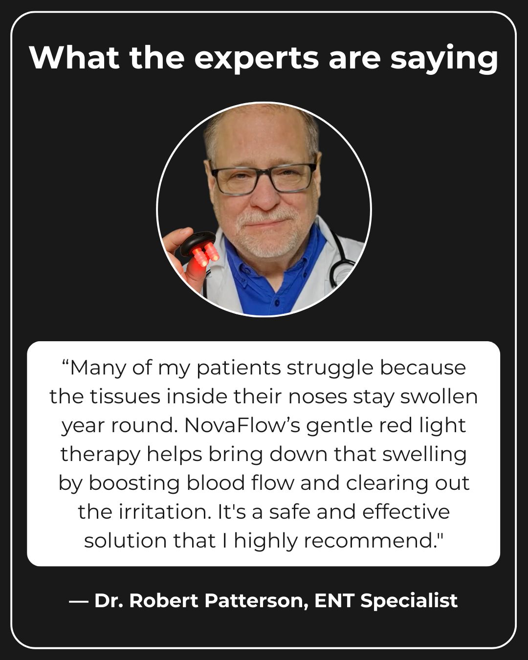 “Many of my patients struggle because the tissues inside their noses stay swollen year round. NovaFlow’s gentle red light therapy helps bring down that swelling by boosting blood flow and clearing out the irritation. It's a safe and effective solution that I highly recommend."