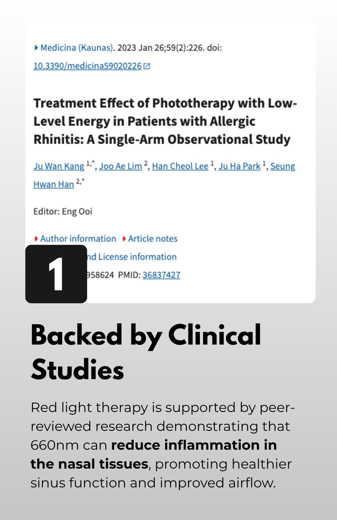 Clinically calibrated 660 nm red light penetrates deep sinus tissue, easing inflammation for fast, lasting relief.